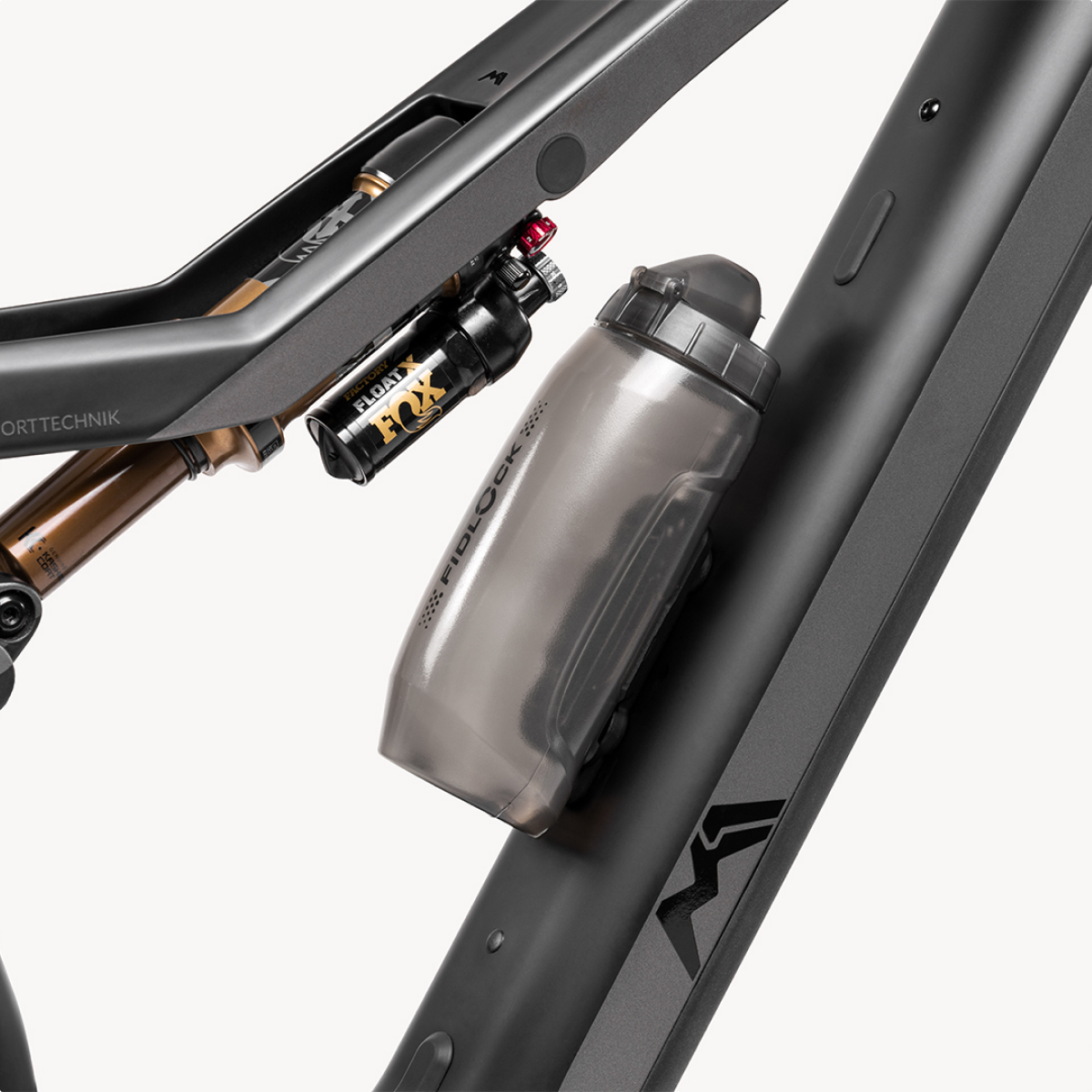 Einhand-Bedienung ohne Bügel – die Flasche sitzt sicher, wackelt nicht und lässt dem Fahrwerk volle Bewegungsfreiheit.